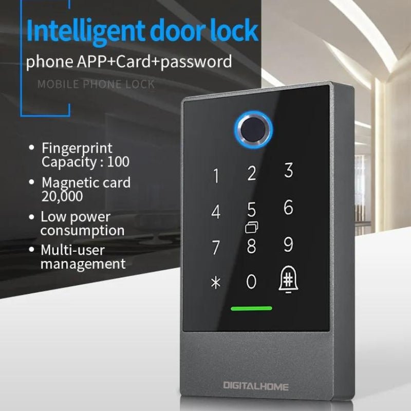 The smart door lock is suitable for office glass doors. It enables you to enter your office with a pin code from its touchscreen pad, with your mobile phone through a Bluetooth connection, or with an RFID Card. It also has a built-in time and attendance capability.