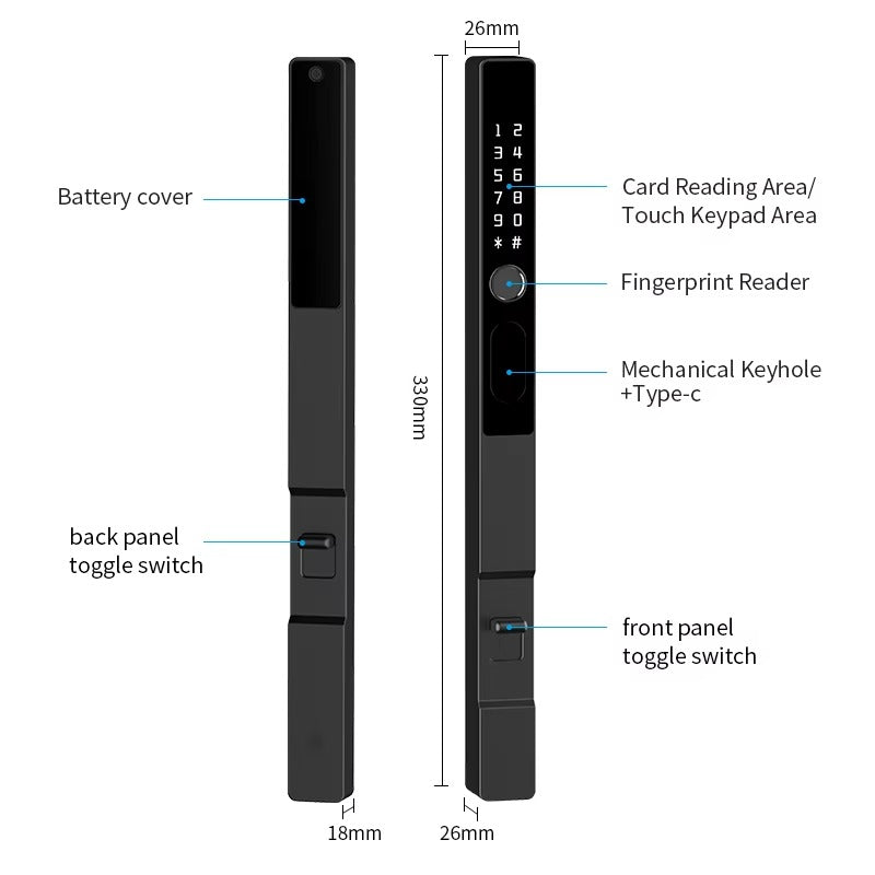 Mobile App: Globe Suite Dimension: 330mm x 26mm x 18mm Fingerprint: 100 RFID: 100 Moible App: 1000 PIN Code: 1000 Battery: 4pcs AAA Weight: 1.6kg Material: Aluminum Door thickness: 32-65mm