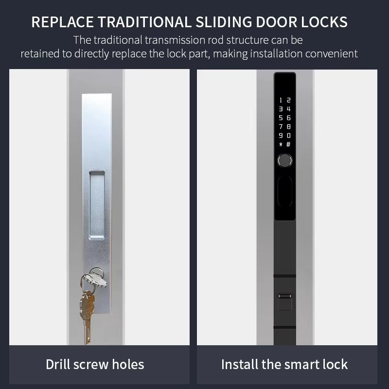 A smart lock that lets you conveniently enter your home or office using your fingerprint or smartphone. This specialized smart lock is designed for aluminum-framed sliding doors, combining modern security with effortless access and style.