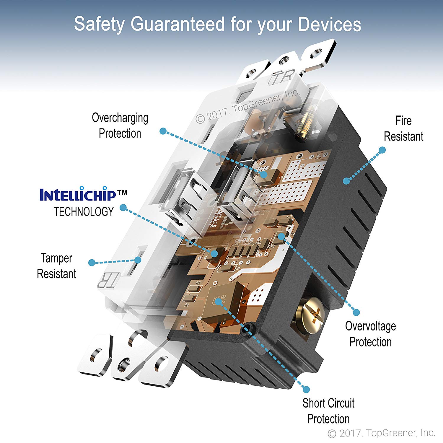 Child safe - tamper-resistant duplex receptacle increases safety by preventing unwanted objects from being inserted into the outlets.